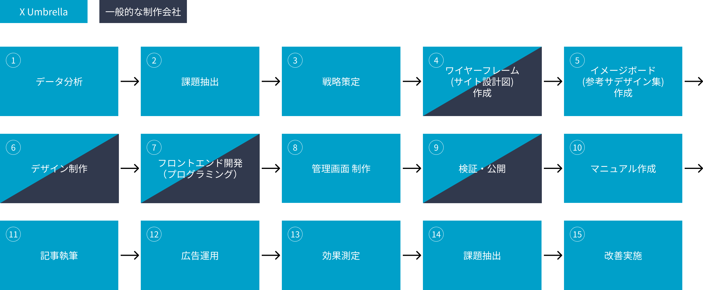 コンテンツの追加・修正、導線の見直し、デザインの微調整、機能の開発、広告の最適化など、必要な施策を迅速に実施。この改善サイクルを継続的に回すことで、サイトを「育てていく」パートナーとして伴走し続けます。