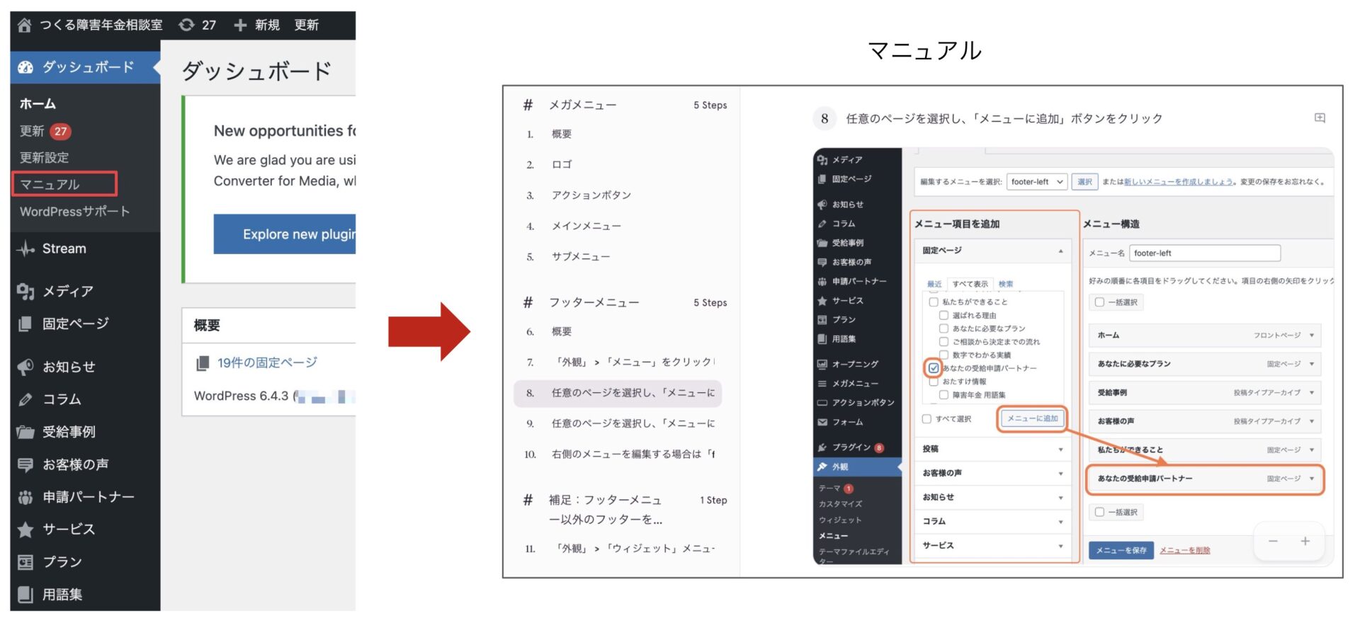 各ページの編集、記事の投稿、画像の差し替え、お知らせの更新など、実際に使う機能に絞った分かりやすいマニュアルをご用意。基本的にマニュアルが必要が無いほど、直感的に分かりやすい管理画面を構築しますが、WordPress管理画面上にメニューを設置し、すぐに編集方法などを確認ができるようにしております。