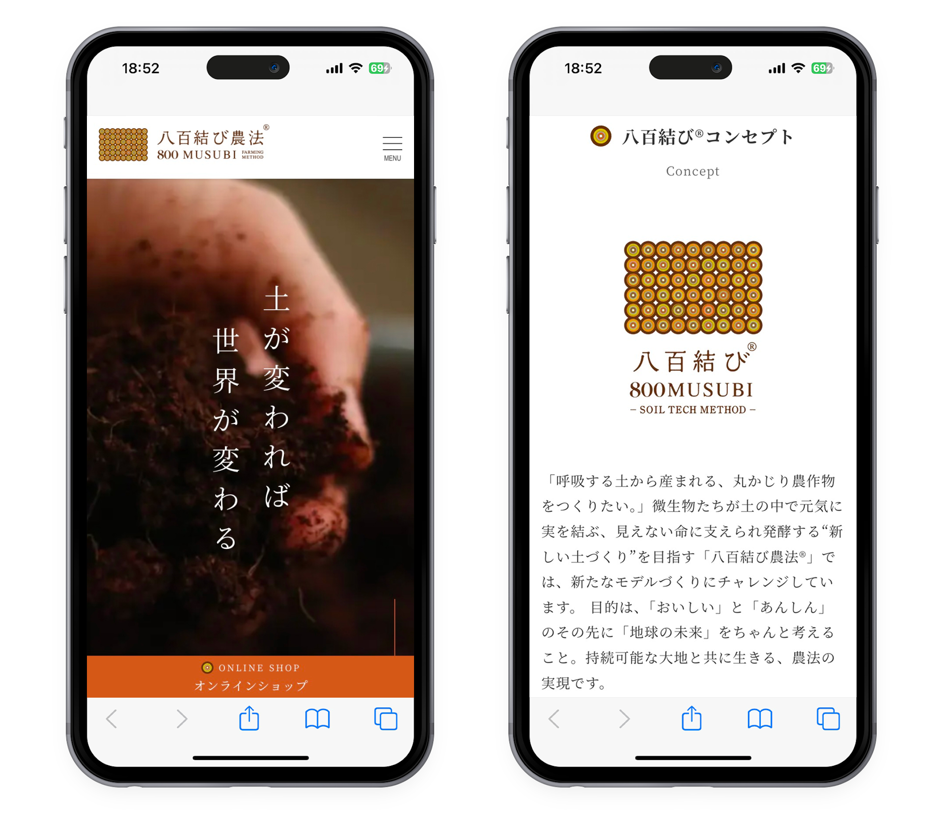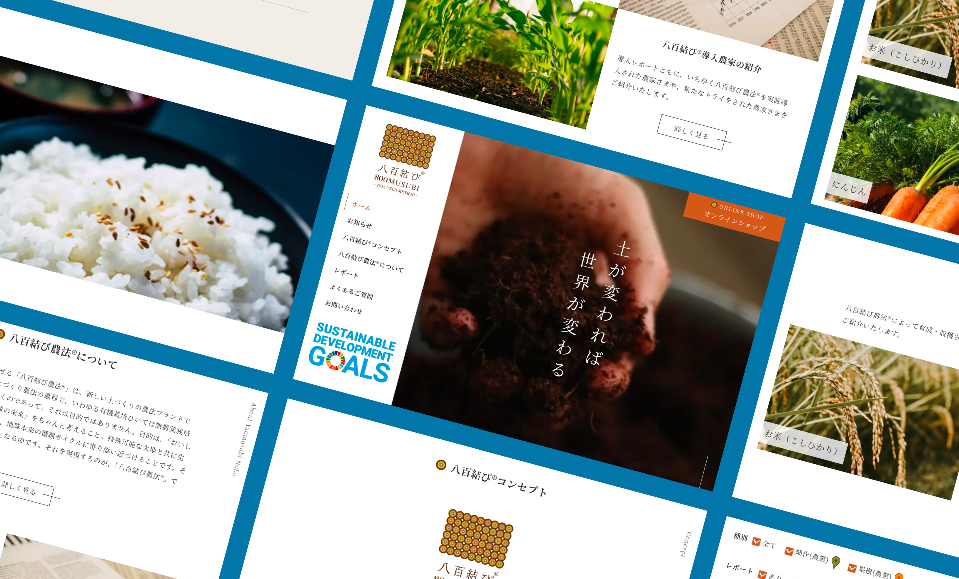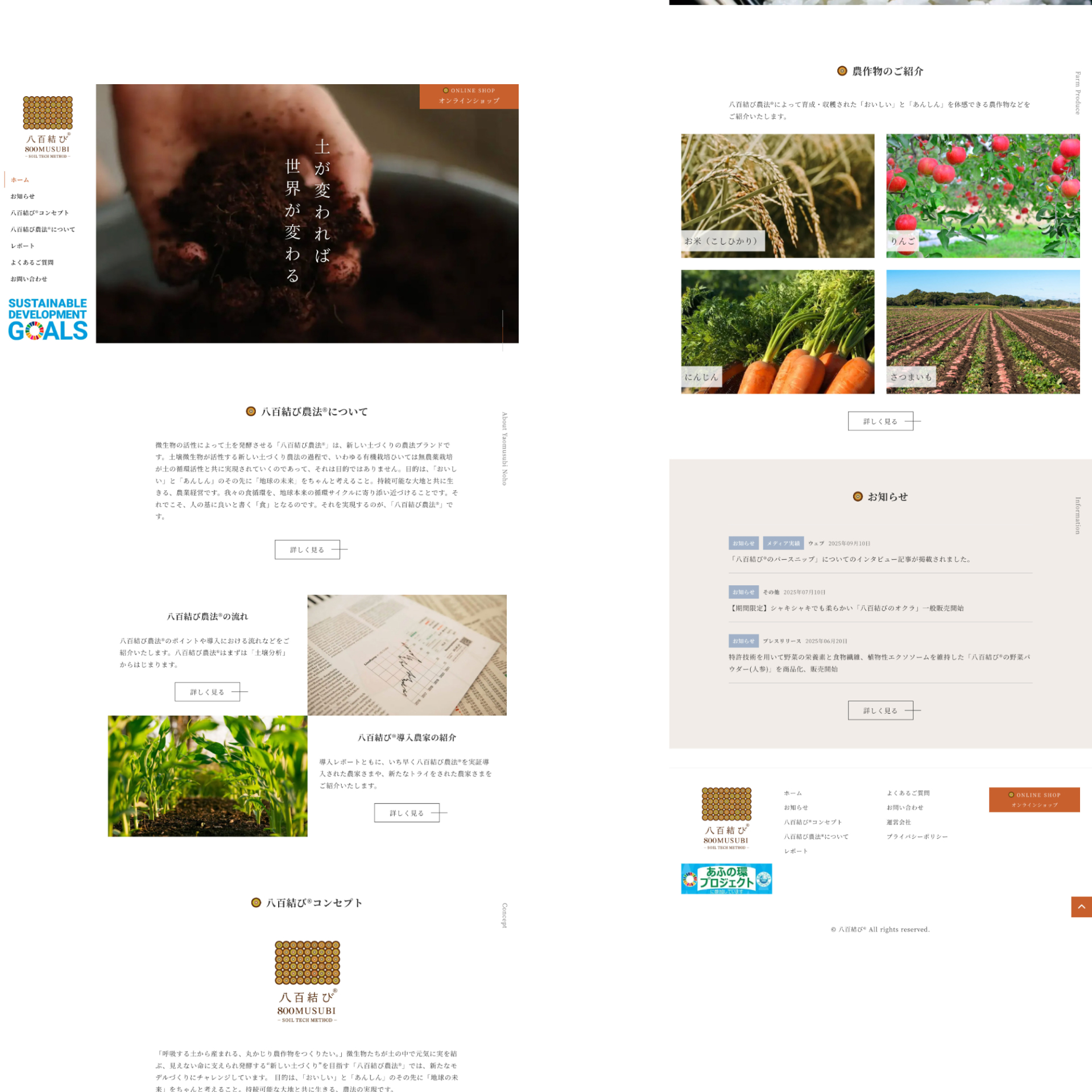 農家への八百結び農法®導入支援と、八百結び農法®で作った農作物を別ドメインのオンラインショップで販売しているため、農家と一般消費者への認知度向上・ブランディング訴求を狙った新規サイト制作のご依頼でした。